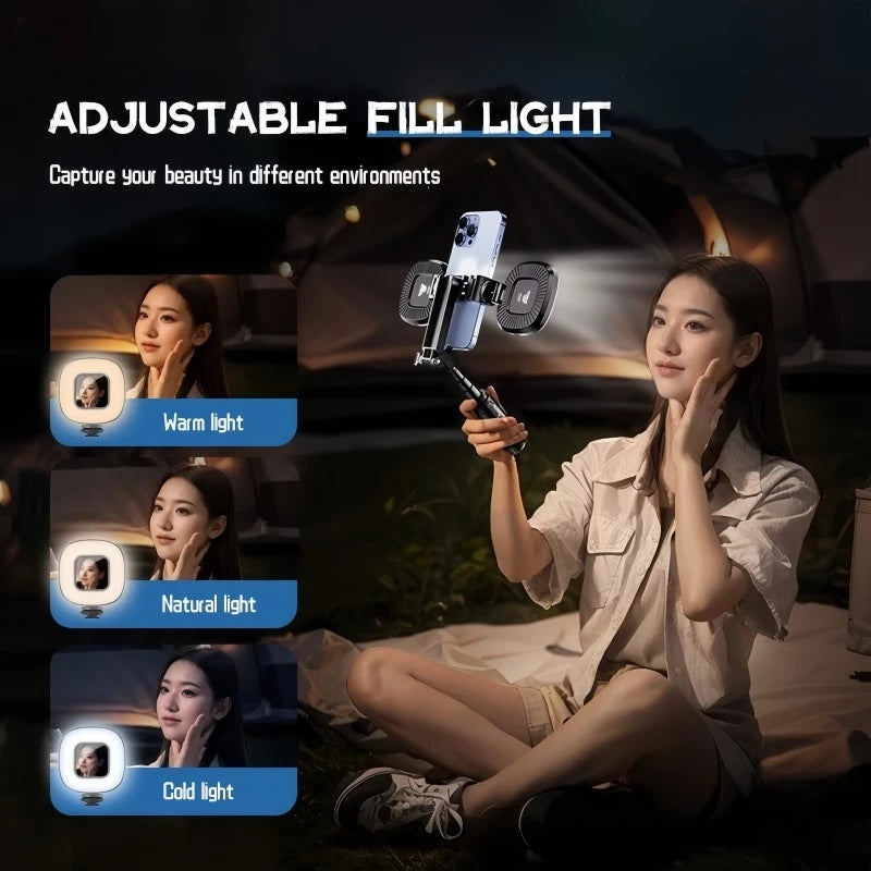 P15 can be a selfie stick or a mobile phone holder.At the bottom of the selfie stick, unfold the three legs to create a tabletop tripod.In normal situations on a flat surface, the shorter its extension, the more stable it is. A stable and balanced tripod for selfies and video calls.